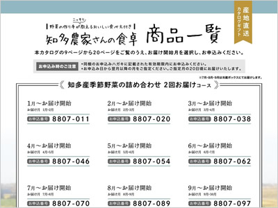 ![]() 1回お届けから12回お届けまで、ご予算に合わせてコースをお選びください。月ごとの旬野菜をご紹介しており、先様は開始する月をご指定いただけます。 |