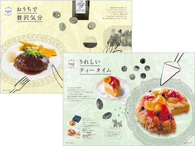 ![]() ところどころに可愛い挿絵が入った、見ているだけでも楽しいカタログです。お料理の写真もとってもおしゃれ。 |